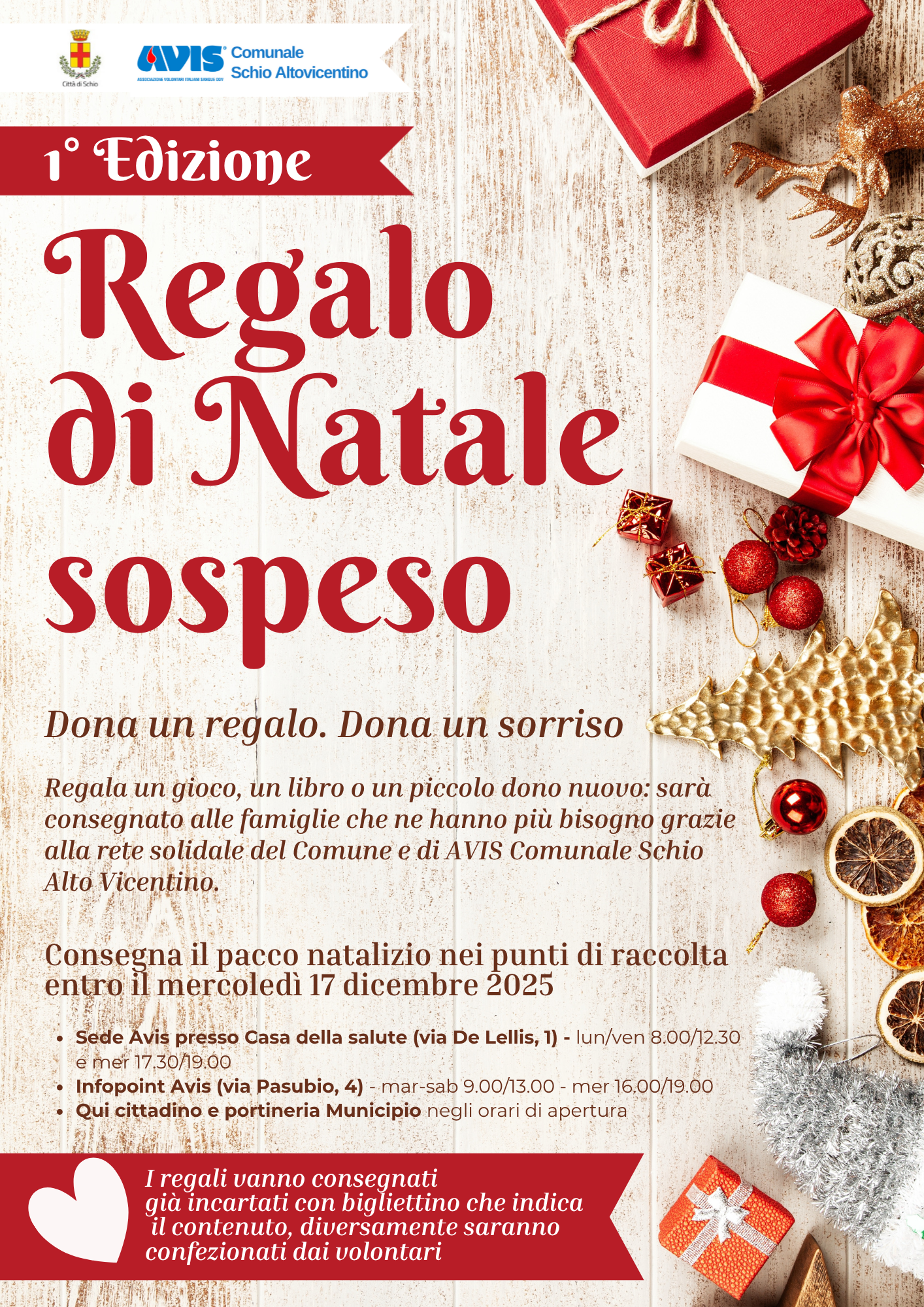 Con l’avvicinarsi delle festività e mentre in città iniziano ad accendersi lo spirito del Natale, a Schio prende vita un’iniziativa che unisce solidarietà, attenzione sociale e senso di comunità. È il “Regalo di Natale sospeso”, il nuovo progetto promosso dal Comune di Schio in collaborazione con AVIS Comunale Schio Altovicentino, pensato per regalare un sorriso ed un piccolo conforto alle famiglie che vivono situazioni di fragilità economica o sociale.