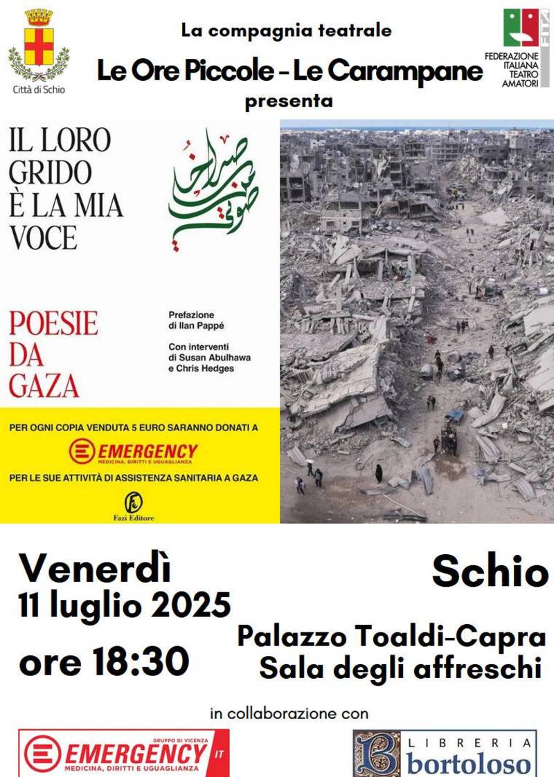 Venerdì 11 luglio 2025, dalle ore 18:00 alle 20:30, la Sala Affreschi di Palazzo Toaldi Capra ospiterà la presentazione del libro Il loro grido è la mia voce (Fazi Editore, 2025), una raccolta di poesie di autori palestinesi, molte delle quali scritte a Gaza dopo il 7 ottobre 2023, in un contesto segnato dalla guerra e dalla sofferenza civile.