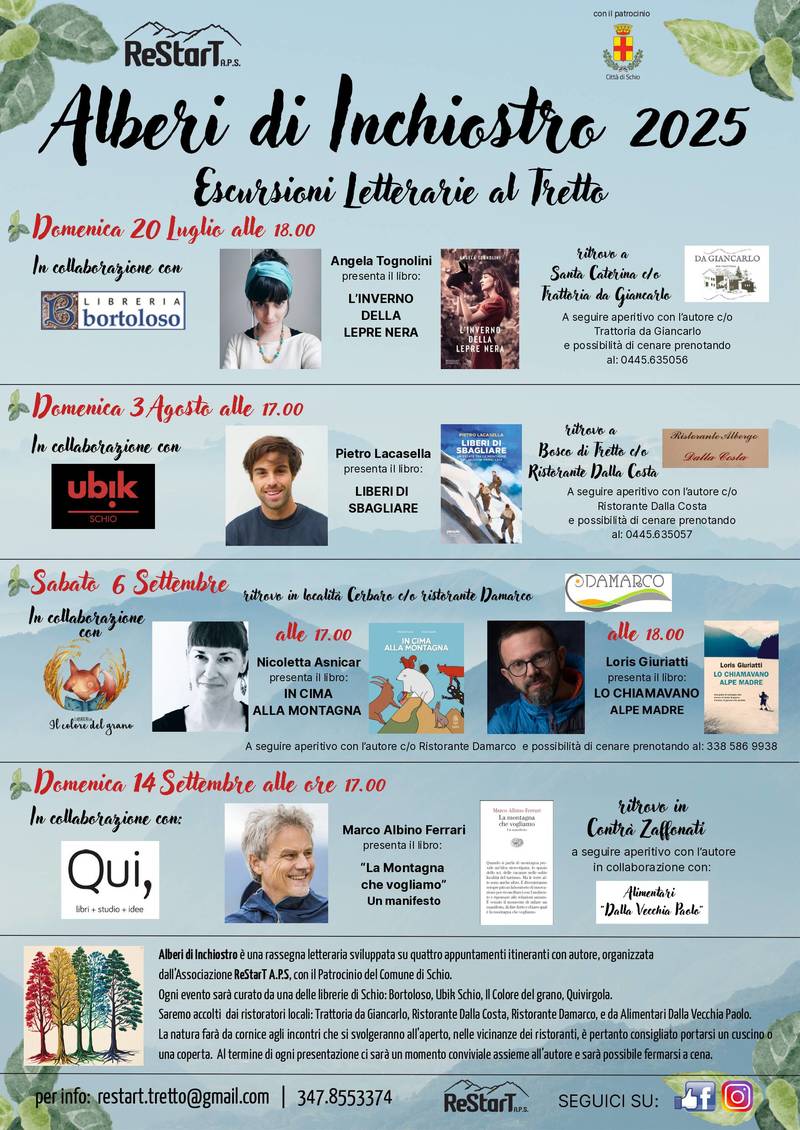 La collina e la montagna come scenario naturale per racconti, riflessioni e incontri. Si chiama “Alberi di Inchiostro” ed è la nuova rassegna letteraria estiva che animerà l’altopiano del Tretto con quattro appuntamenti, tra luglio e settembre, in compagnia di scrittori e scrittrici che intrecciano nei loro testi la natura, il paesaggio e l’esperienza umana. Un’iniziativa inedita promossa dall’associazione ReStart APS, con il patrocinio e il contributo del Comune di Schio che punta a valorizzare le colline e le montagne del territorio attraverso proposte culturali di qualità.