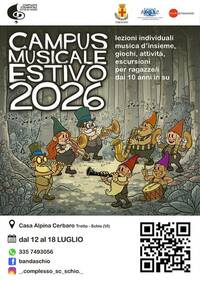 Periodo: dal 12 al 18 luglio Luogo: Casa Alpina, Cerbaro Età: ragazzi dai 10 anni in su Iscrizioni: entro il 18 giugno Info e prenotazioni: Complesso Strumentale Città di Schio335 7493056 Presentazione del Campus: merc 29 aprile h. 20 Sala Affreschi Palazzo Toaldi Capra