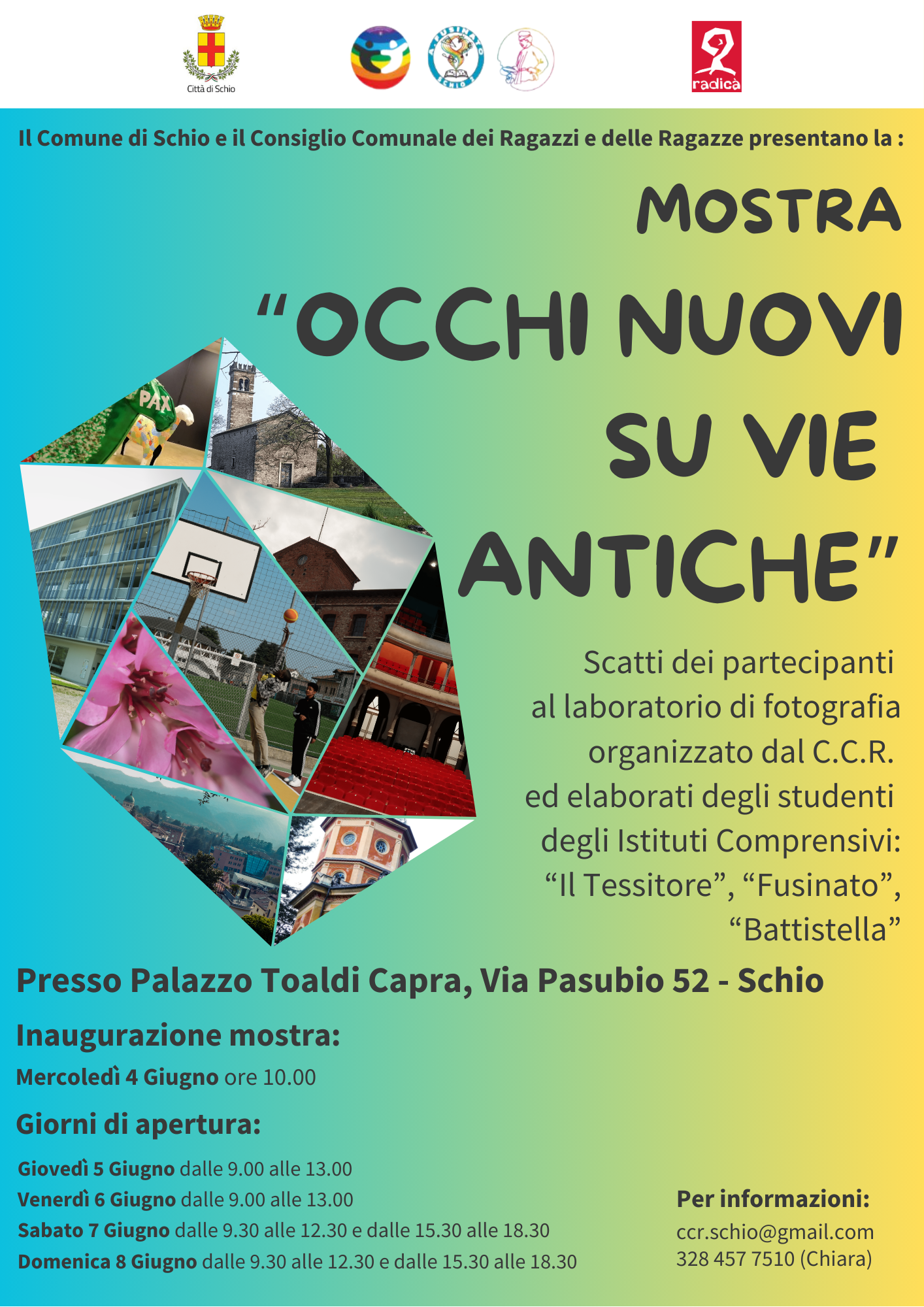 - Mostra occhi nuovi su vie antiche - Esposizione fotografica che dà voce e sguardo ai più giovani, capaci di rileggere con originalità e sensibilità la città attraverso l’obiettivo di una macchina fotografica. La mostra è il risultato del percorso svolto dal Consiglio Comunaledei Ragazzi e delle Ragazze (CCRR) di Schio, in collaborazione con le scuole secondarie di primo grado cittadine. Periodo 5-6-7-8 giugno 2025